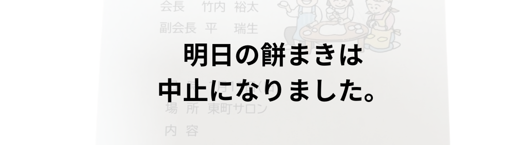 明日11日(日)のもちまきは中止となりました。楽しみにしてくださっていた方、申し訳ありません。